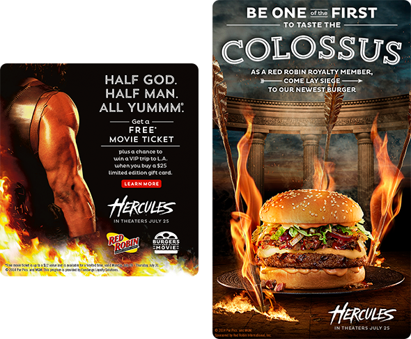 Red Robin partnered with Paramount Pictures and Fandango for their "Burgers and a Movie" marketing campaign. The overall goals were to promote the latest film release of "Hercules" by offering gift card deals and discounts towards the movie-themed burger in participating restaurants.
